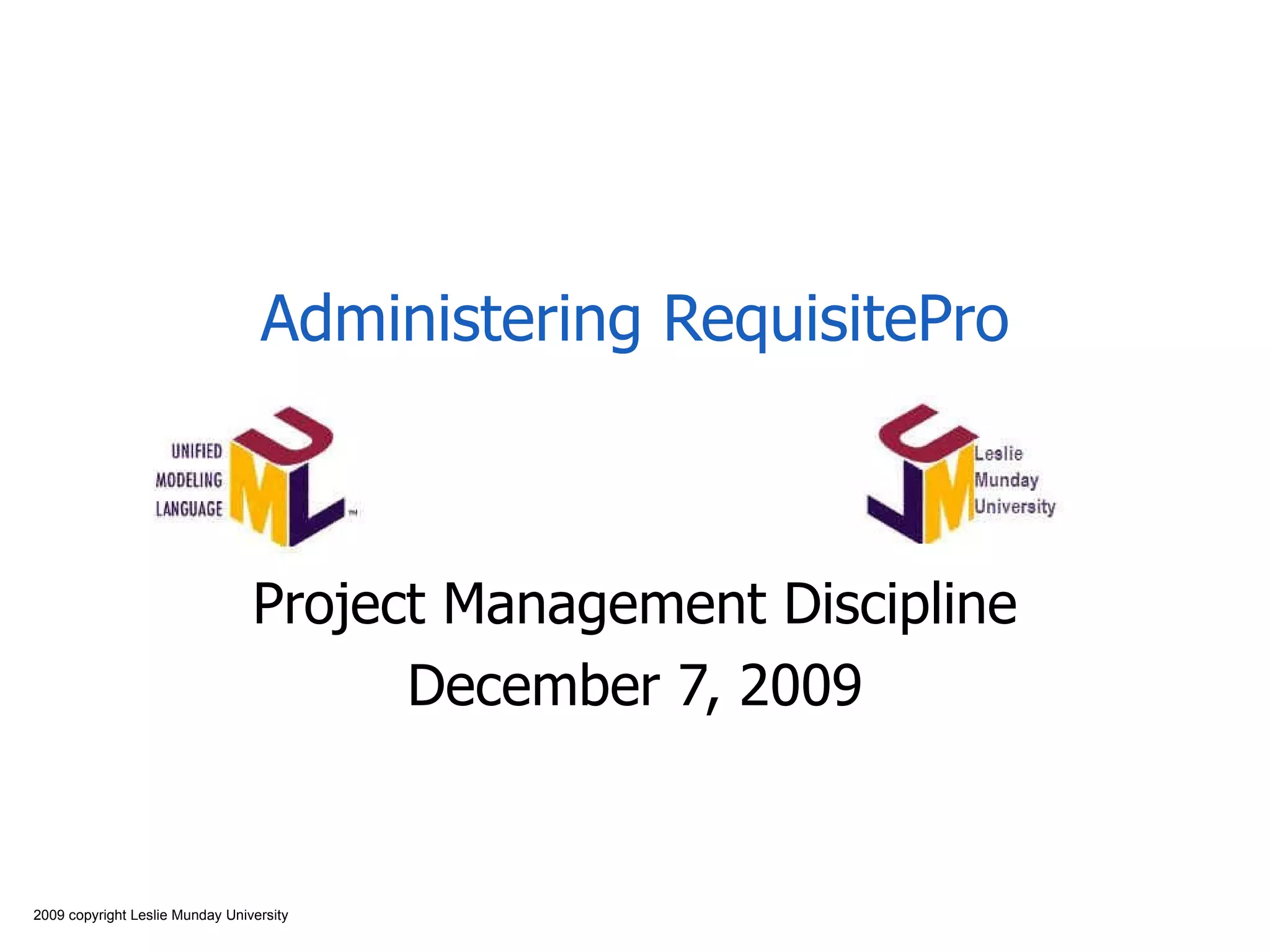 This document provides an overview of how to manage projects, documents, requirements, security, and linking projects in RequisitePro project management software. It discusses creating projects from templates, setting project and document properties, maintaining requirement and attribute types, managing user groups and permissions, and linking projects to allow for tracing requirements between projects. The exercises at the end demonstrate creating a new project from a template, defining requirement and document types, setting user group permissions to restrict editing of requirement attributes to certain roles, and linking the new project to an external project for requirements tracing.