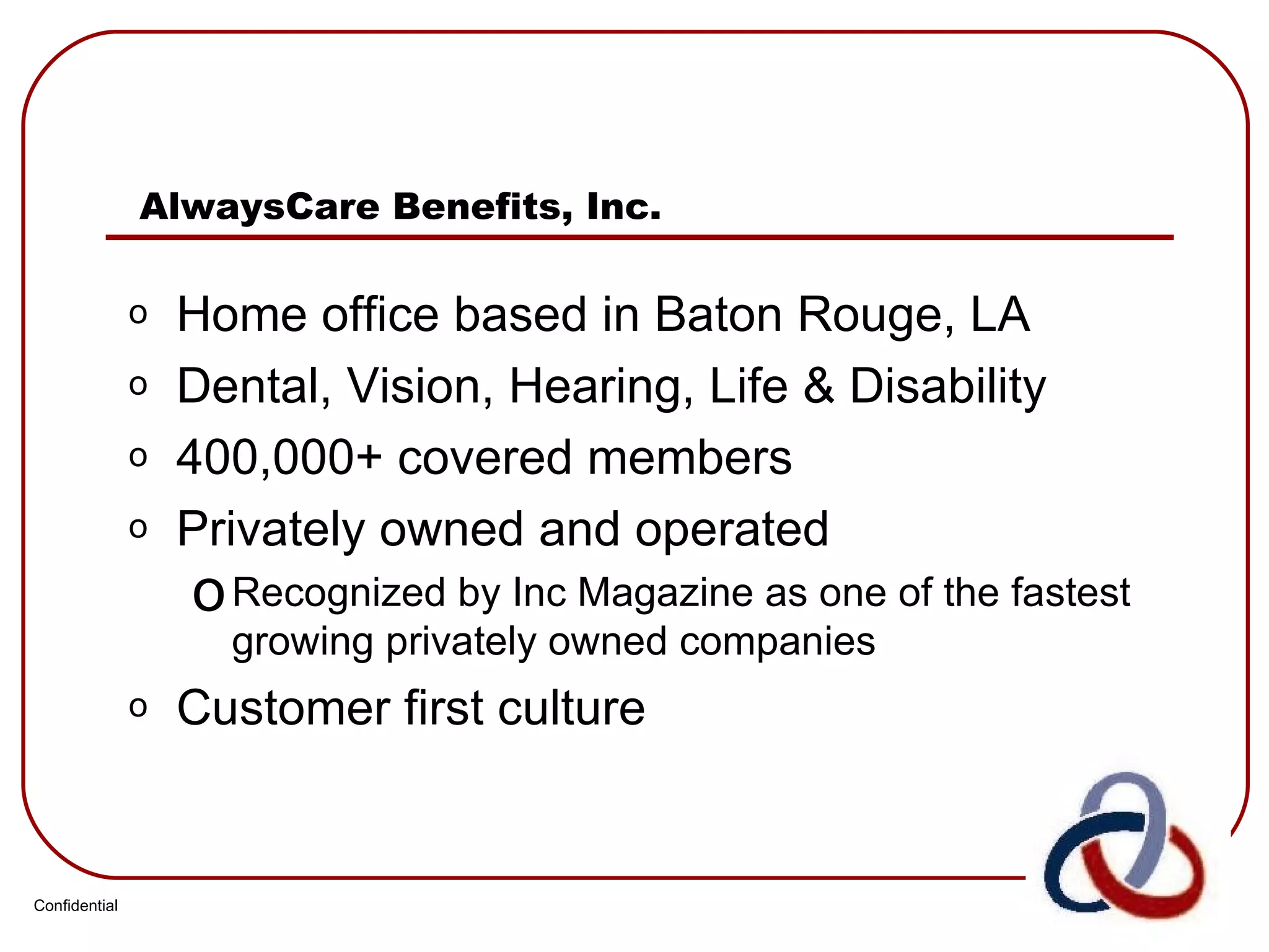 - AlwaysCare Benefits is a privately owned company based in Baton Rouge, LA that provides dental, vision, hearing, life and disability benefits to over 400,000 members.