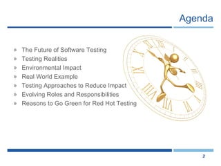 The document discusses the environmental impact of software testing and approaches to reduce it. It notes that ineffective testing wastes resources and impacts the environment. It provides examples of how poorly defined roles and lack of processes led to wasted CPU usage and unnecessary test environments at one company. Finally, it outlines reasons for testing teams to adopt green practices like minimizing travel, using electronic documentation, and reusing test environments to realize financial and environmental benefits.