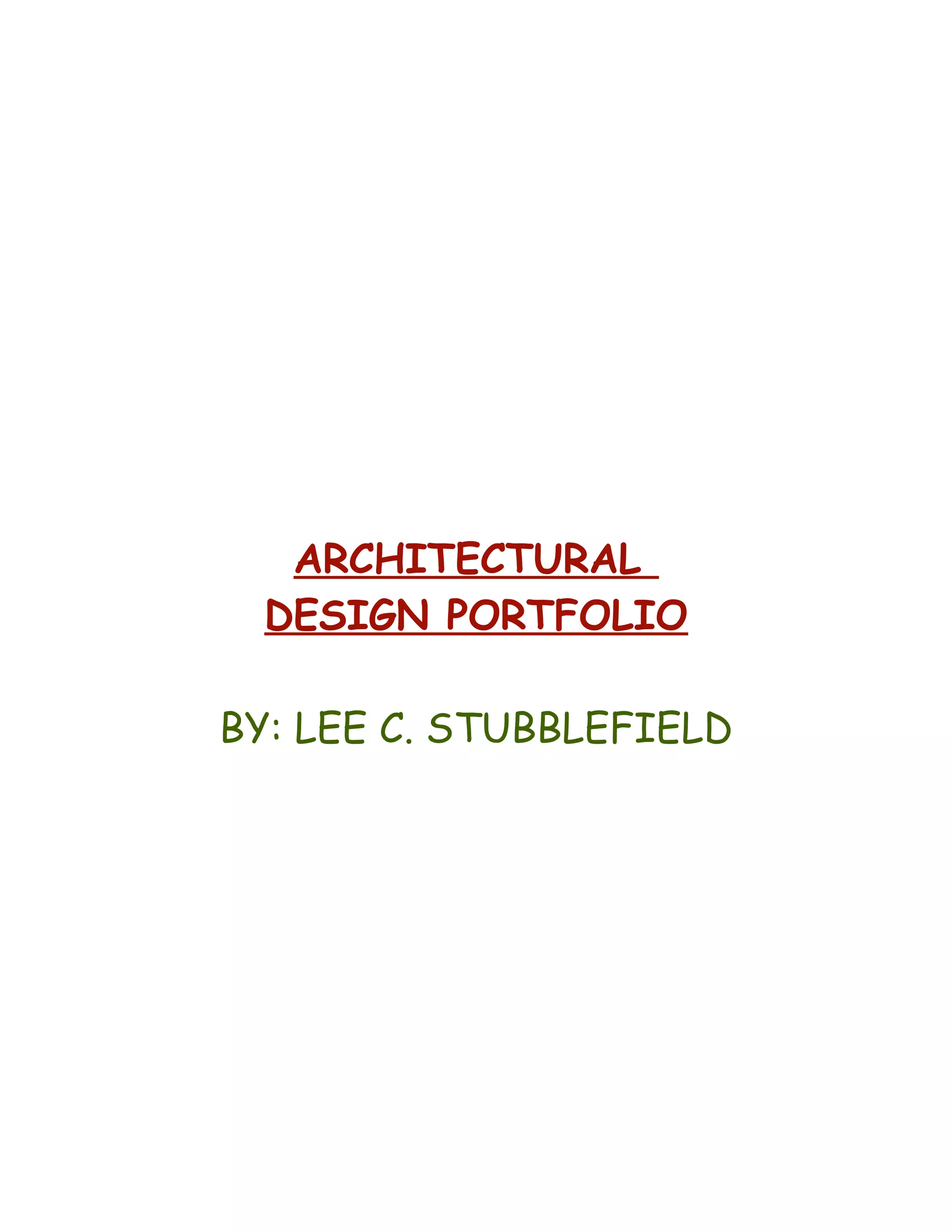 This document appears to be the index page of an architectural design portfolio belonging to Lee C. Stubblefield. It includes summaries and pages for projects involving transitions in imagery, isometric and oblique drawings, color theory studies, one-point and two-point perspective drawings, a bird house design, residential designs, a light industrial building design, a retail/corporate tower, and a high school design completed using various drafting techniques and software.