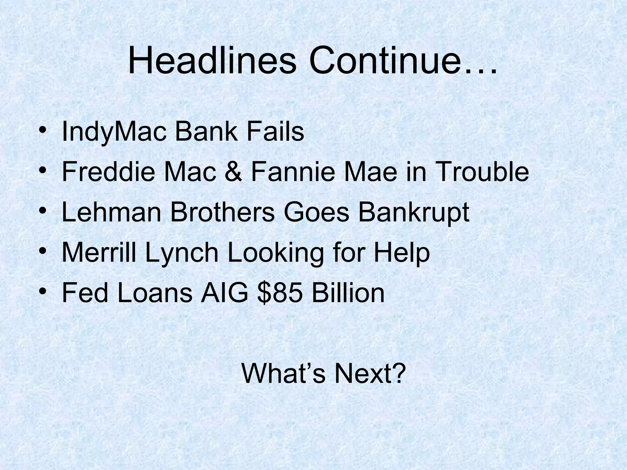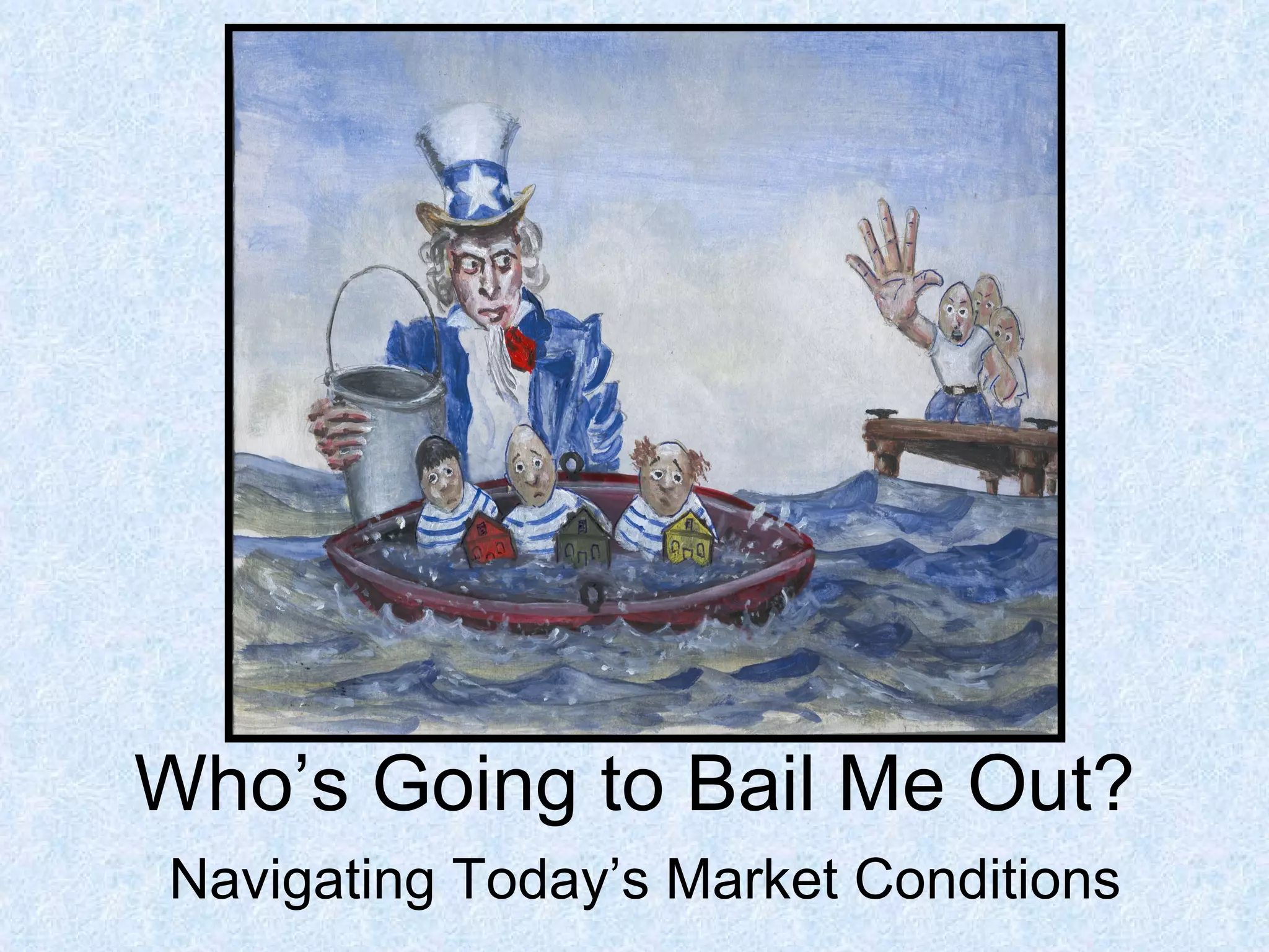 The document discusses the 2008 financial crisis and government bailouts. It provides background on how risky mortgage lending practices led to the crisis. It describes major events like the failures of Lehman Brothers, AIG receiving an $85 billion bailout from the federal government, and the $700 billion Troubled Asset Relief Program bailout. It considers risks of the government stepping in or not stepping in during a financial crisis and notes the economy may continue to struggle even after bailouts.