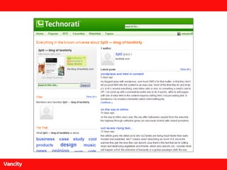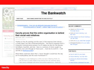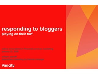 The document discusses the importance of engaging with online conversations about financial services through blogging and social media. It emphasizes that blogs can significantly influence consumer perceptions and stresses the necessity for organizations to respond authentically to both positive and negative feedback. Recommendations include monitoring online discussions and adapting communication strategies to maintain trust and transparency.