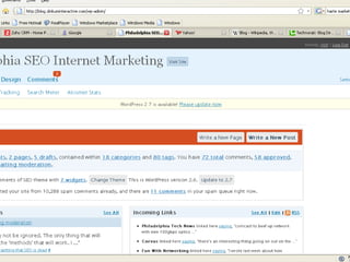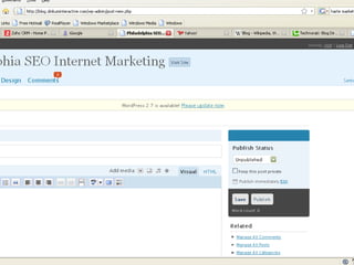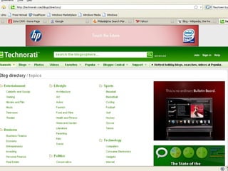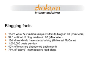This document provides information and tips for starting a successful blog. It discusses blogging statistics, different types of blogs, getting started with domain names and content, promoting the blog through search engines and social media, engaging readers, using analytics, and maintaining a consistent posting schedule. The key points are to do market research on your topic, find your niche or angle, build an audience through commenting on other blogs, and focus on creating engaging, unique, and timely content.