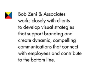 Bob Zeni & Associates works closely with clients to develop visual strategies that support branding and create compelling communications. One project involved creating a corporate-wide communications program for Baxter International to establish leadership expectations for 75,000 employees globally. The challenge was to create an engaging presentation that consolidated a large amount of information about shared values, competencies, and personal attributes in a way that was easy to use and conformed to Baxter's corporate identity.