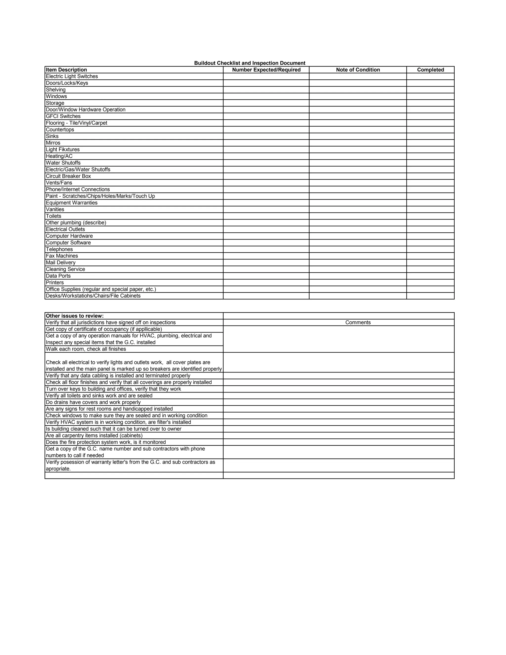 The checklist inspects various building components and systems for a new buildout including electric, plumbing, HVAC, finishes, and technology installations. It notes the expected/required quantity and condition of each item. Additional items to review include verifying permits, manuals, special installations, room finishes, electrical and data cabling, flooring, keys/locks, plumbing, windows, HVAC operation, cleaning, fire protection, contractor contact info, and warranty documents. The comprehensive inspection ensures the new space is fully built out and operational as required.