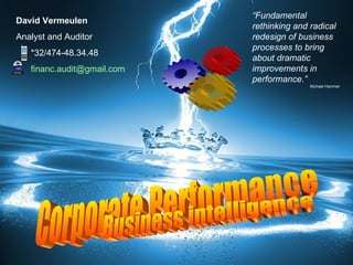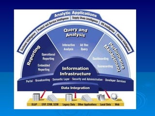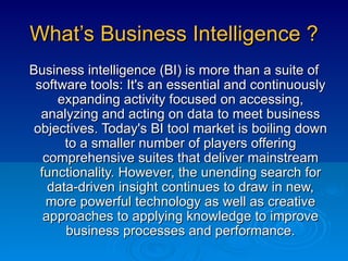 Business intelligence (BI) involves analyzing data to meet business objectives and improve performance. BI tools provide comprehensive suites for accessing, analyzing, and acting on data from the front-end through visualization tools and dashboards, to the back-end infrastructure. BI solutions help companies effectively manage knowledge and intellectual capital to increase profitability through strategies like knowledge management and business performance management.