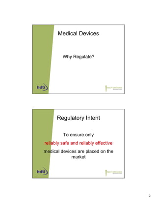 The document provides an overview of CE marking requirements for medical devices in Europe. It discusses regulations that require medical devices to be safely and effectively designed and developed. Regulations are in place to ensure devices placed on the market do not compromise patient safety or health. Manufacturers must implement a risk management system and conduct clinical evaluations or reviews of scientific literature to demonstrate a device's safety and performance. Notified bodies assess and provide approval for higher risk devices. Manufacturers must maintain technical files and address post-market surveillance requirements. Standards can be used to demonstrate compliance with regulatory requirements.