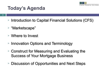 The document outlines innovation strategies for mortgage lenders, emphasizing the need to adapt to changing market conditions by improving operational efficacy and cost management. It discusses various outsourcing options, including business process outsourcing (BPO) and knowledge process outsourcing (KPO), as methods for lenders to enhance efficiency while focusing on core competencies. The text also highlights the importance of risk management, data integrity, and leveraging technology to achieve competitive advantages in the evolving mortgage industry.
