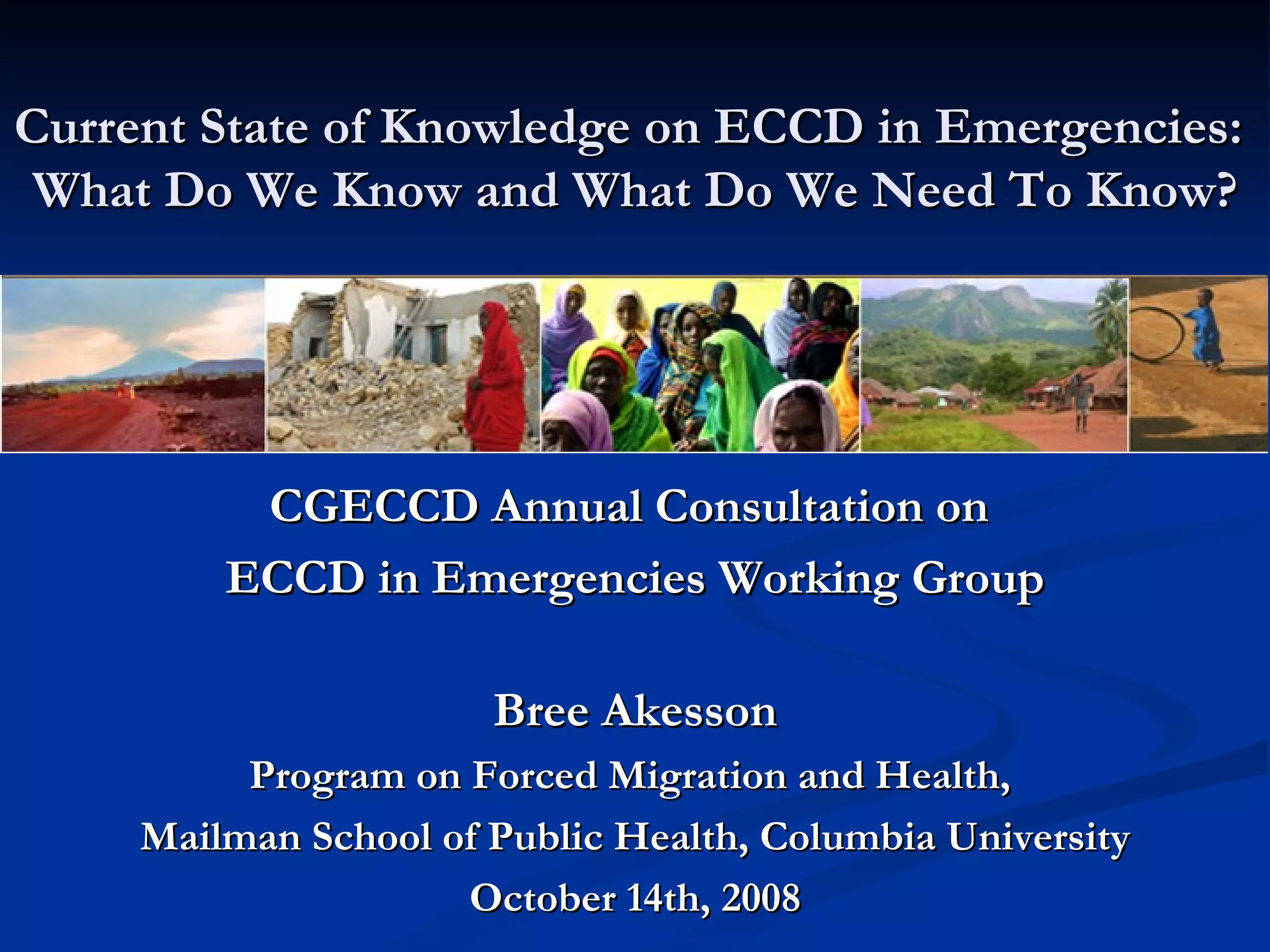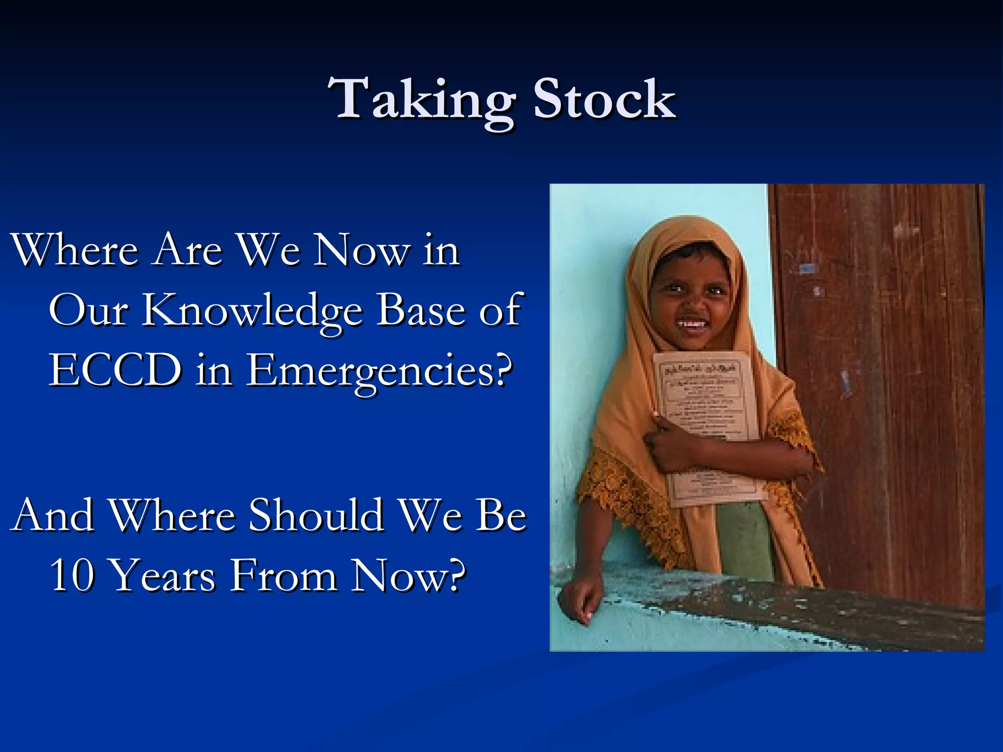 The document discusses the current state of knowledge around early childhood care and development (ECCD) in emergency settings. It notes that while awareness of the importance of ECCD in emergencies has grown, significant gaps remain in understanding how to best support young children. It calls for more robust research that incorporates local contexts and uses mixed methodologies to evaluate interventions. Within 10 years, the document envisions ECCD being better integrated with other sectors and informed by an evidence base of promising practices developed through collaborative networks.