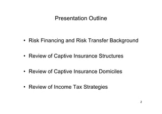 The document outlines strategies for captive insurance for high net-worth clients, including an overview of captive insurance structures and domiciles. It discusses pure captives, group captives, rent-a-captives and protected cell captives. Key considerations for captive insurance include tax strategies under IRS revenue rulings and using captives for estate planning.