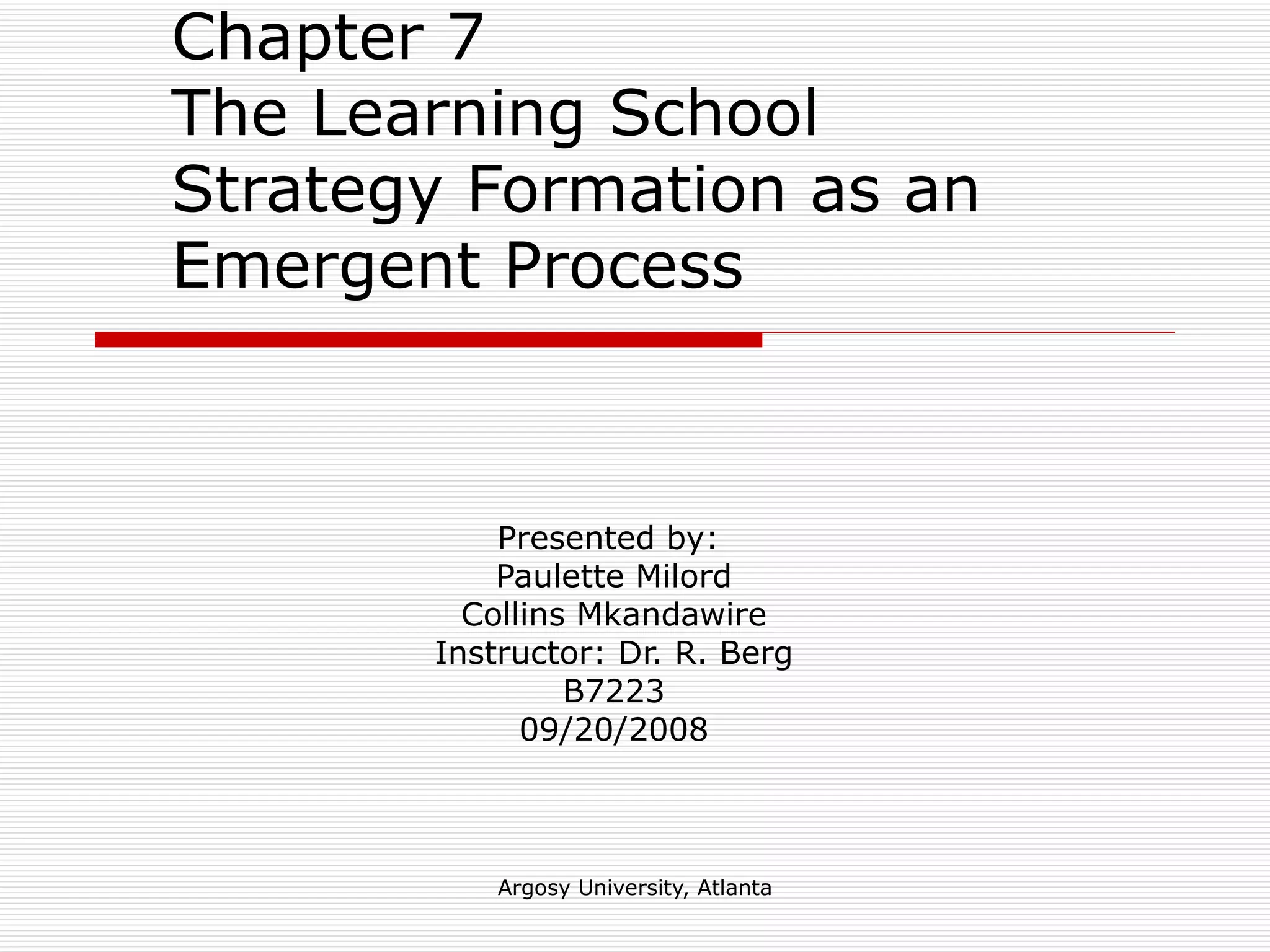 This document summarizes the learning school strategy formation approach. It describes the learning school as conceptualizing strategy as an emergent process rather than a deliberately formulated plan. The learning school views strategies as developing incrementally through a process of trial and error. It also sees organizational learning as important for allowing strategies to emerge through processes like retrospective sensemaking, knowledge creation, and developing dynamic capabilities. The document outlines contributions of the learning school like explaining complex phenomena through simple methods, as well as potential limitations like it providing no discipline and allowing unwanted strategies to emerge.