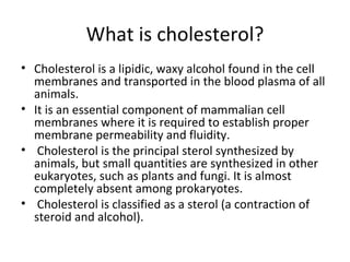 Cholesterol is a lipid found in cell membranes that is essential for life but high levels are associated with health risks. It can be synthesized by the body or absorbed from dietary sources like eggs and meat. While cholesterol itself is necessary, high levels of low-density lipoprotein (LDL) cholesterol carried in the bloodstream can build up in arteries and increase risk of cardiovascular diseases. Dietary carbohydrates tend to raise triglyceride levels, which are carried by very low-density lipoproteins (VLDL) and can become dense, smaller LDL particles that are more strongly linked to heart disease. Therefore, high carbohydrate diets may negatively impact heart health more through triglycerides rather than cholesterol itself.