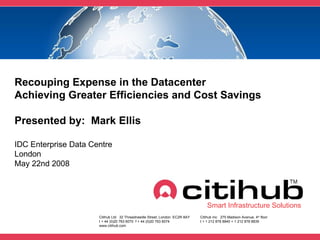 The document discusses ways for datacenters to achieve greater efficiencies and cost savings. It outlines how energy costs are driving total cost of ownership increases for servers. It then provides examples of infrastructure and facilities efficiency measures including virtualization, consolidation, global dynamic grids, cool refresh upgrades, whitebox servers, mechanical and electrical improvements like containment units, combined heat and power systems, and optimizing operating temperatures. Fast payback initiatives focus on minimizing application impact while longer term strategies challenge traditional placement and provisioning approaches.