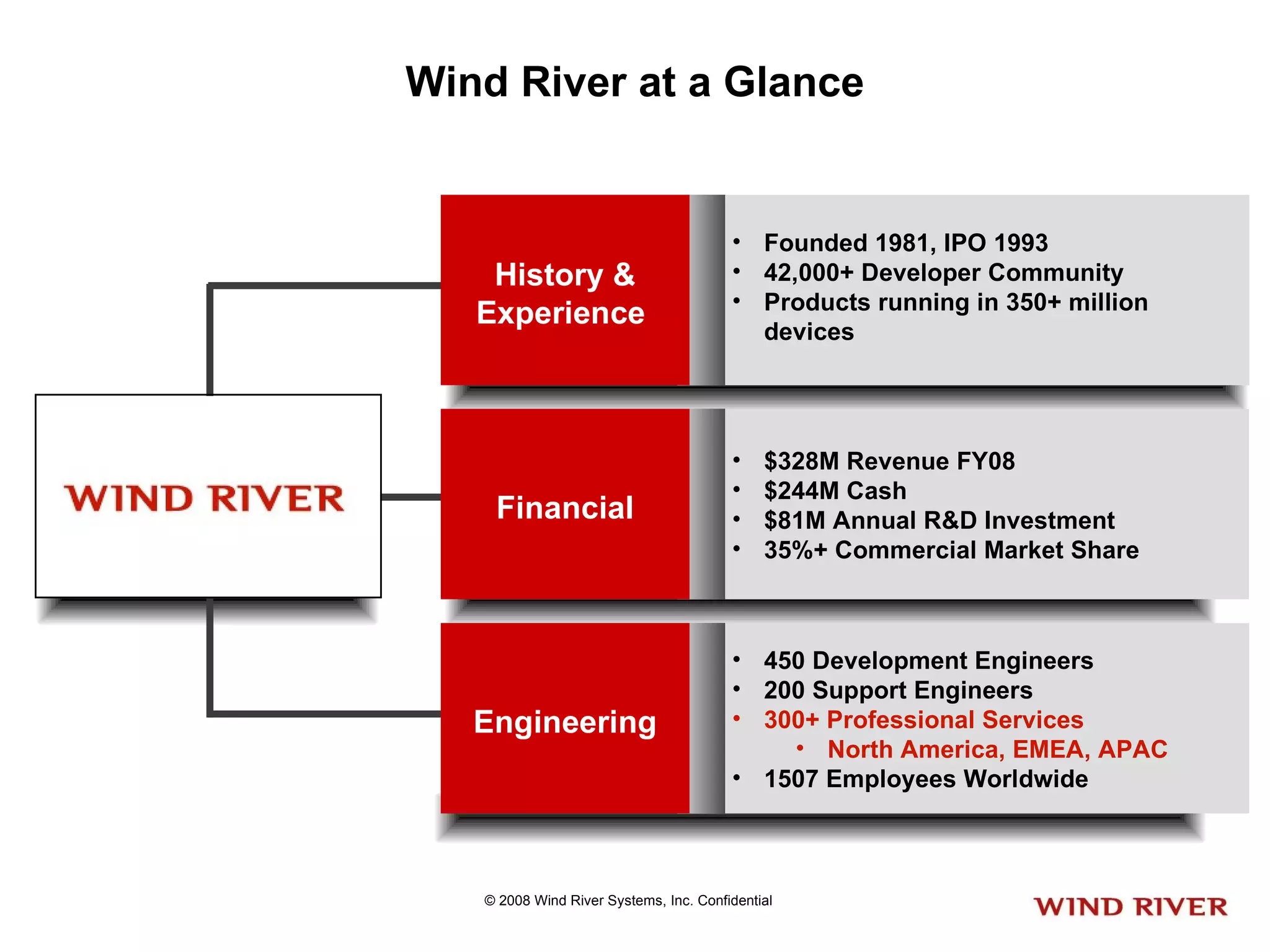 Wind River is a software company founded in 1981 with over 42,000 developers. It has $328M in revenue and focuses on embedded operating systems, development tools, and professional services. It has over 1,500 employees worldwide working on products that are used in over 350 million devices.