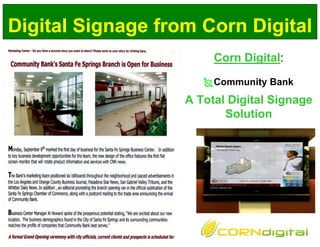 This document promotes Corn Digital's digital signage solutions for businesses like Community Bank. It summarizes that Community Bank uses Corn Digital's Ceres-86V media player to display marketing materials on an LCD screen in order to reduce customer wait times and also play cable TV. The digital signage solution from Corn Digital can reinforce brand image, reduce wait times, promote specials, introduce new products, inform customers, and increase loyalty.