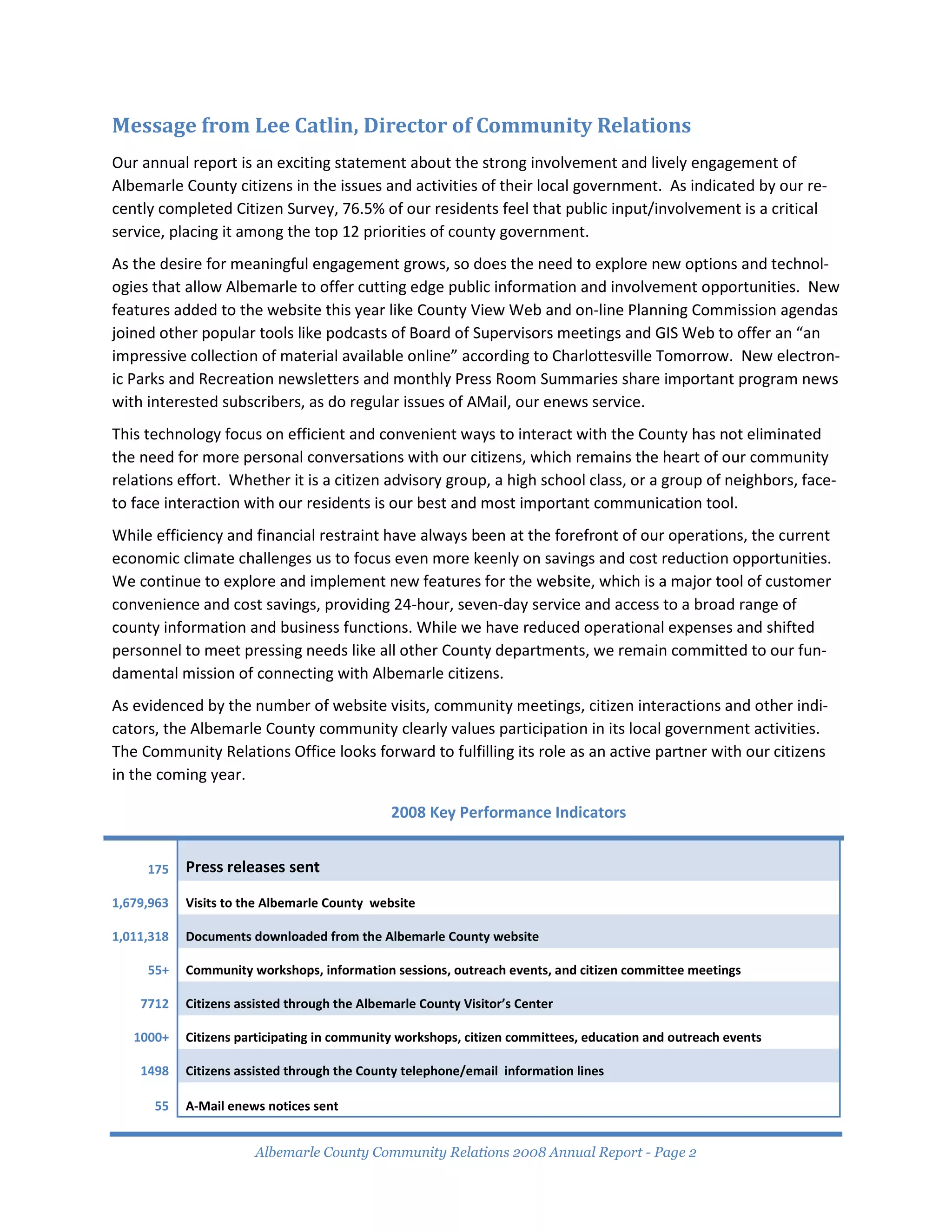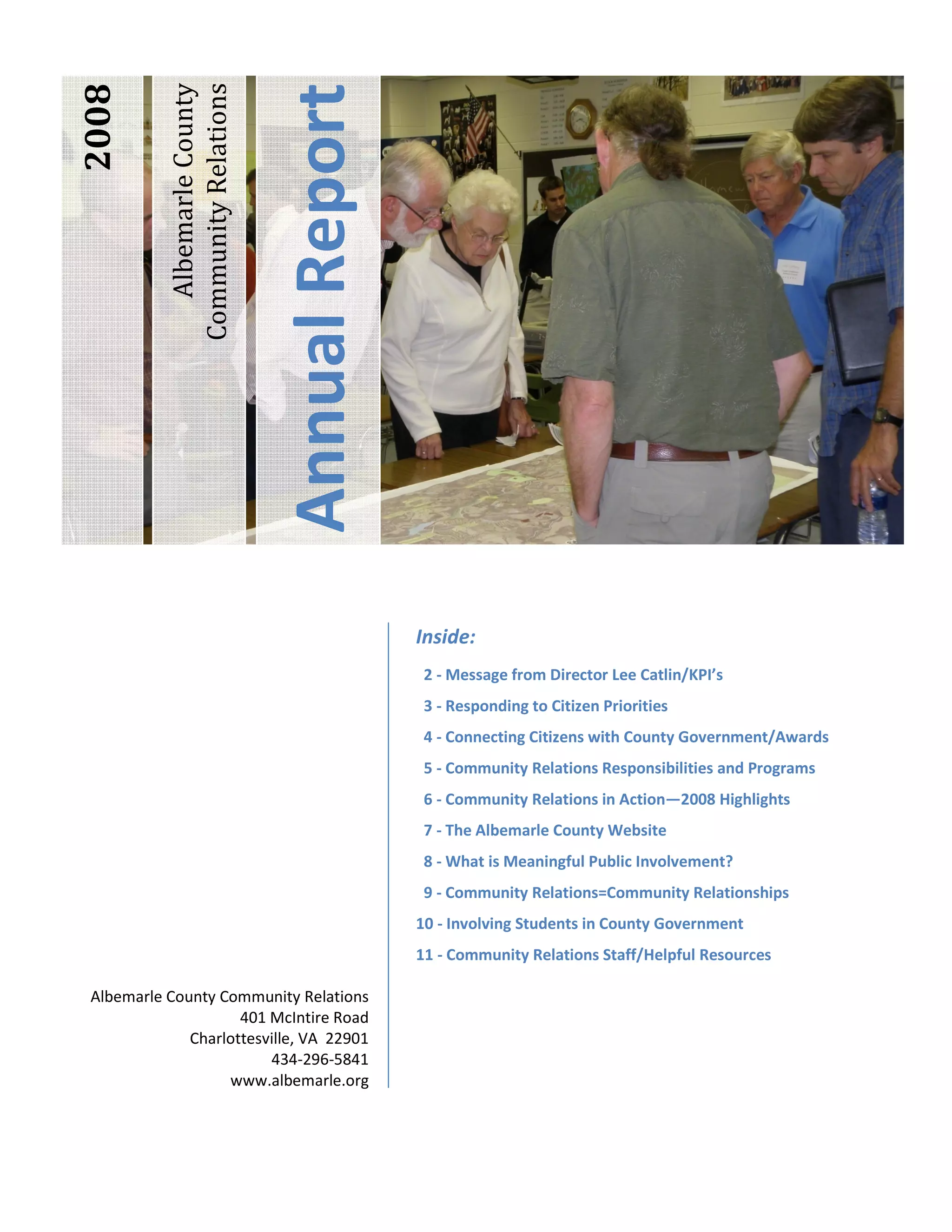 This document provides an annual report from the Albemarle County Community Relations department. It summarizes the department's activities in 2008, which included 175 press releases, over 1.6 million website visits, and many community workshops and citizen committee meetings. It outlines the department's responsibilities like media relations, website management, and facilitating citizen participation. It also discusses efforts to increase online public input opportunities and the usage and functionality of the county website to better engage and inform citizens.