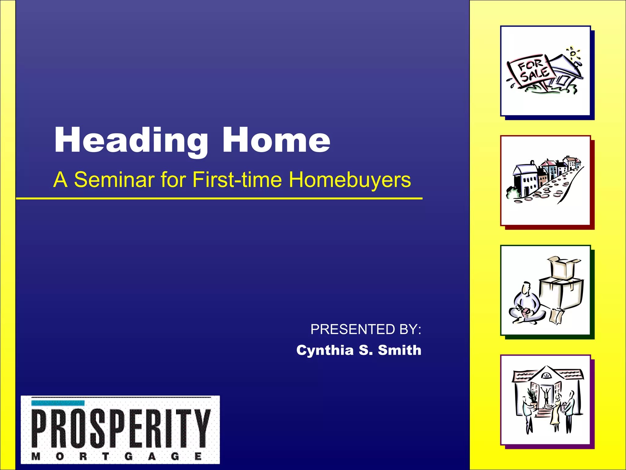 The document provides information about the home buying process for first-time homebuyers. It discusses determining how much home you can afford, the importance of credit, mortgage options including government and conventional loans, closing costs, and the steps involved in the mortgage application and approval process. The overall goal is to educate homebuyers so they can choose the right mortgage program and home to fit their needs and budget.