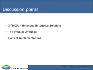 The document introduces Xtenza, a software company that provides web-based business solutions for extended enterprises. It discusses Xtenza's product offerings like eProcuremate and eLogixmate that enable collaboration between buyers, suppliers, logistics partners and others. The solutions integrate with ERP systems and automate inter-enterprise processes like procurement, shipping and payments over the internet.