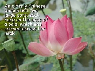 An elderly Chinese woman carried two pots on a pole across her neck each day to fetch water - one pot was perfect while the other had a crack, causing it to only deliver half as much water. For two years this continued, with the cracked pot feeling ashamed of its imperfection. However, the woman had planted flowers along the cracked pot's side of the path, which it watered daily on the walk home. She was able to enjoy the beautiful flowers thanks to the pot's crack. The moral is that our flaws make our lives together interesting and rewarding.