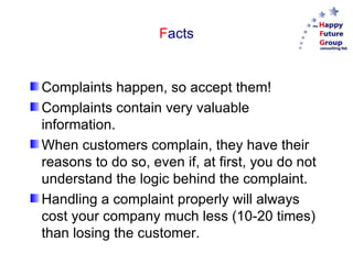 This document outlines a 5-step approach to turning customer complaints into loyalty. The steps are: 1) Review the current complaint situation; 2) Identify areas for improvement; 3) Define actions and procedures; 4) Implement the plan; and 5) Follow up. The goal is to understand customer problems, avoid conflict, and find acceptable solutions in order to create conditions for future sales. Complaints contain valuable feedback and are an opportunity to improve and keep customers satisfied.