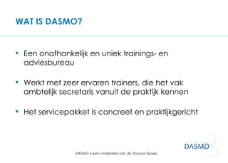 Een onafhankelijk enuniek trainings- en adviesbureau Werkt met zeer ervaren trainers, die het vak ambtelijk secretaris vanuit de praktijk kennen Het servicepakket is concreet en praktijkgericht WAT IS DASMO?