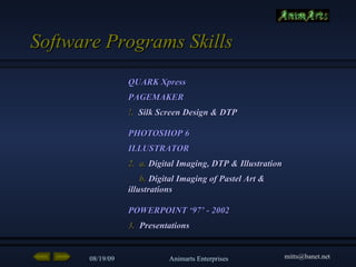 The document lists the applicant's skills with various software programs including Quark Xpress, PageMaker, Photoshop, Illustrator and PowerPoint. They have experience with desktop publishing, digital imaging, photo retouching, illustration, and presentation creation. Specific projects are mentioned like designing logos, brochures, and preparing images for print, web, and animation.
