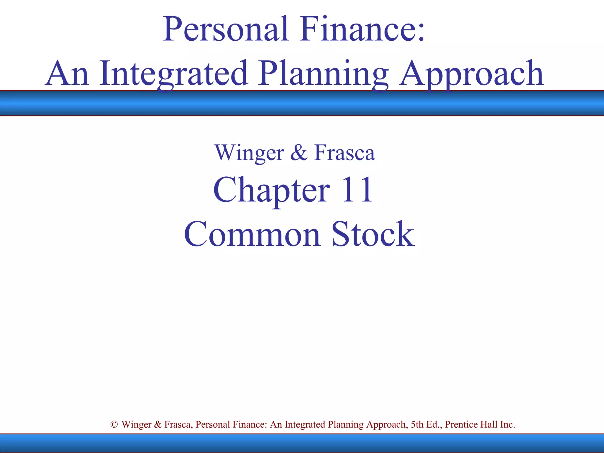 The document summarizes key concepts about common stock, including shareholders' rights, distributions to shareholders, fundamental and technical analysis techniques. It discusses characteristics of common stock like voting rights and residual claims, as well as how earnings and dividends are distributed. Methods of fundamental analysis like CAPM, P/E ratios, and book values are covered. Technical analysis indicators including moving averages and point-and-figure charts are also introduced.