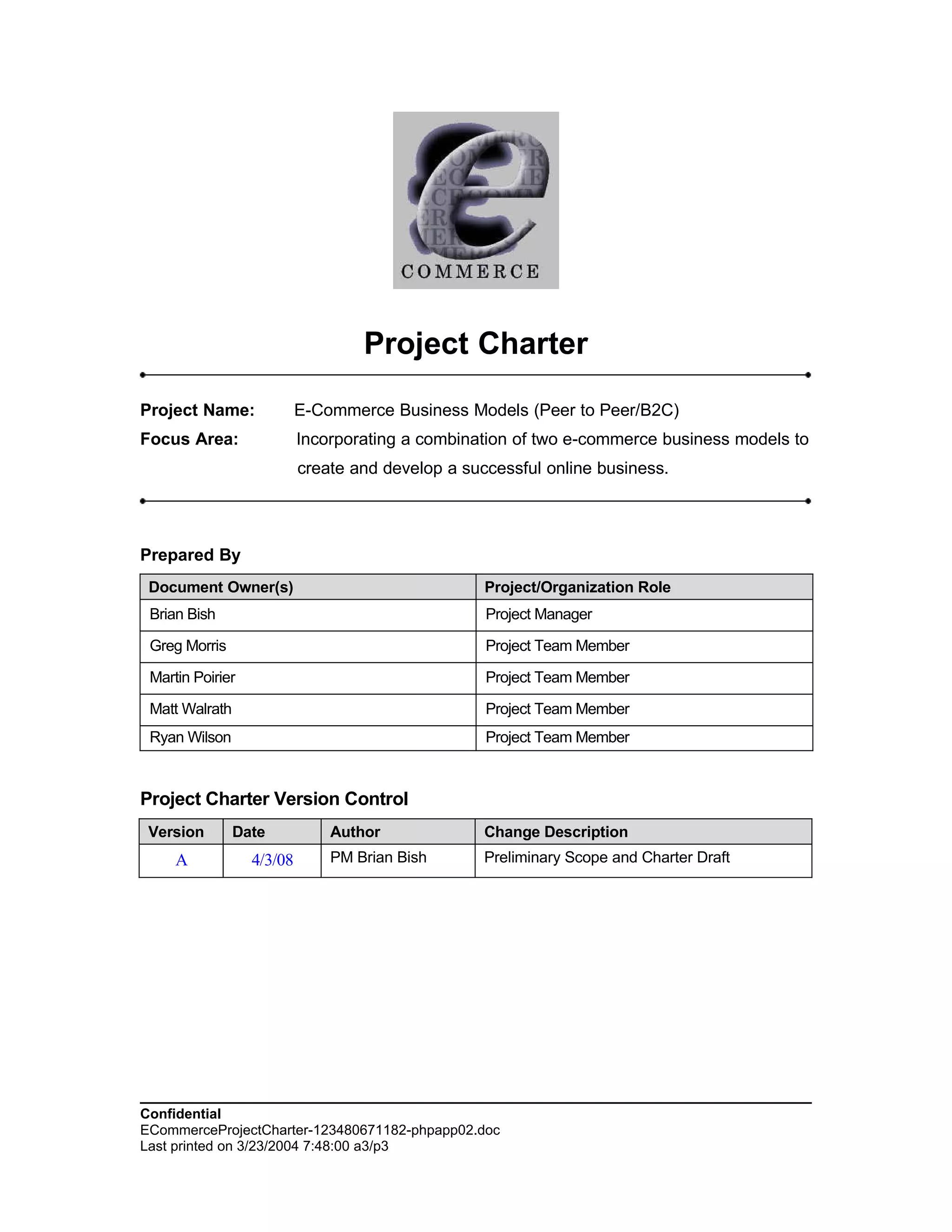 The project charter summarizes plans for an e-commerce website that incorporates peer-to-peer, business-to-consumer, and business-to-business models. The goals are to research these models and apply them to create a successful online business. A project team will define requirements, estimate costs and timelines, develop the site, and ensure it meets stakeholder needs. The project manager will oversee weekly meetings and assign tasks to team members from various departments.