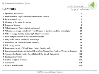 The Environmental Impact Initiative (EII) addresses pressing energy-related challenges, highlighting the need for sustainable practices amidst rising fossil fuel demand and environmental concerns. Its mission is to promote environmental stewardship by showcasing the financial and social benefits of energy conservation and renewable energy projects. The document outlines the current energy landscape in the U.S., including dependency on fossil fuels, the impact of pollution, and emerging technologies like solar and wind energy.