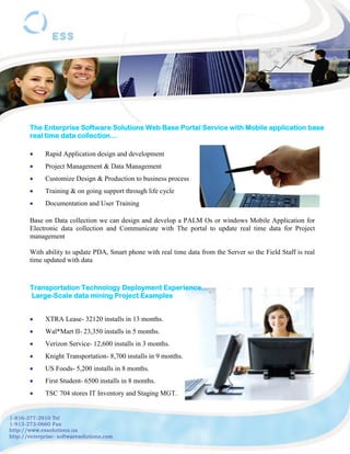 Enterprise Software Solutions provides customized mobile business solutions and rapid application development. They design mobile apps for platforms like Palm OS and Windows Mobile that interface with a web-based portal for real-time data collection and project management. ESS has experience with large-scale deployments for companies across various industries. They partner with technology providers and users to help achieve faster ROI through efficient data management solutions developed within budget and timeline constraints.