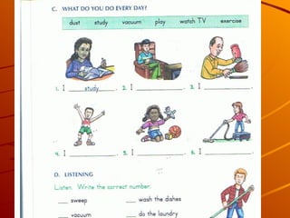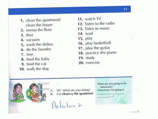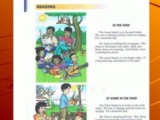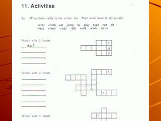 This document outlines resources and activities for beginning ESL learners, emphasizing vocabulary building and grammar, specifically the present continuous tense. It includes references to various educational materials and encourages the use of dictionaries. The overall message promotes engagement in learning English.