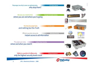 1) The document provides an overview of JPG's Electronics Division, which focuses on electronics for rail applications. 2) The division has 350 employees across centers of expertise in France and Australia, with a product portfolio that includes driving aid systems, train control and monitoring systems, passenger information systems, and auxiliary converters. 3) Key details include annual sales of 60 million euros, 2 million euros spent on R&D, and certification at Safety Integrity Level 4 for some products like ERTMS speed measurement systems.