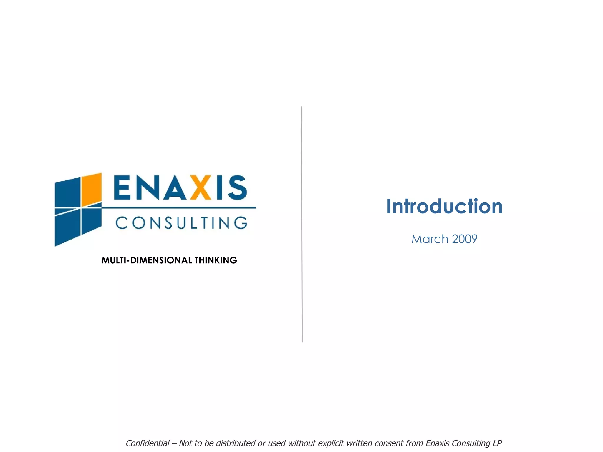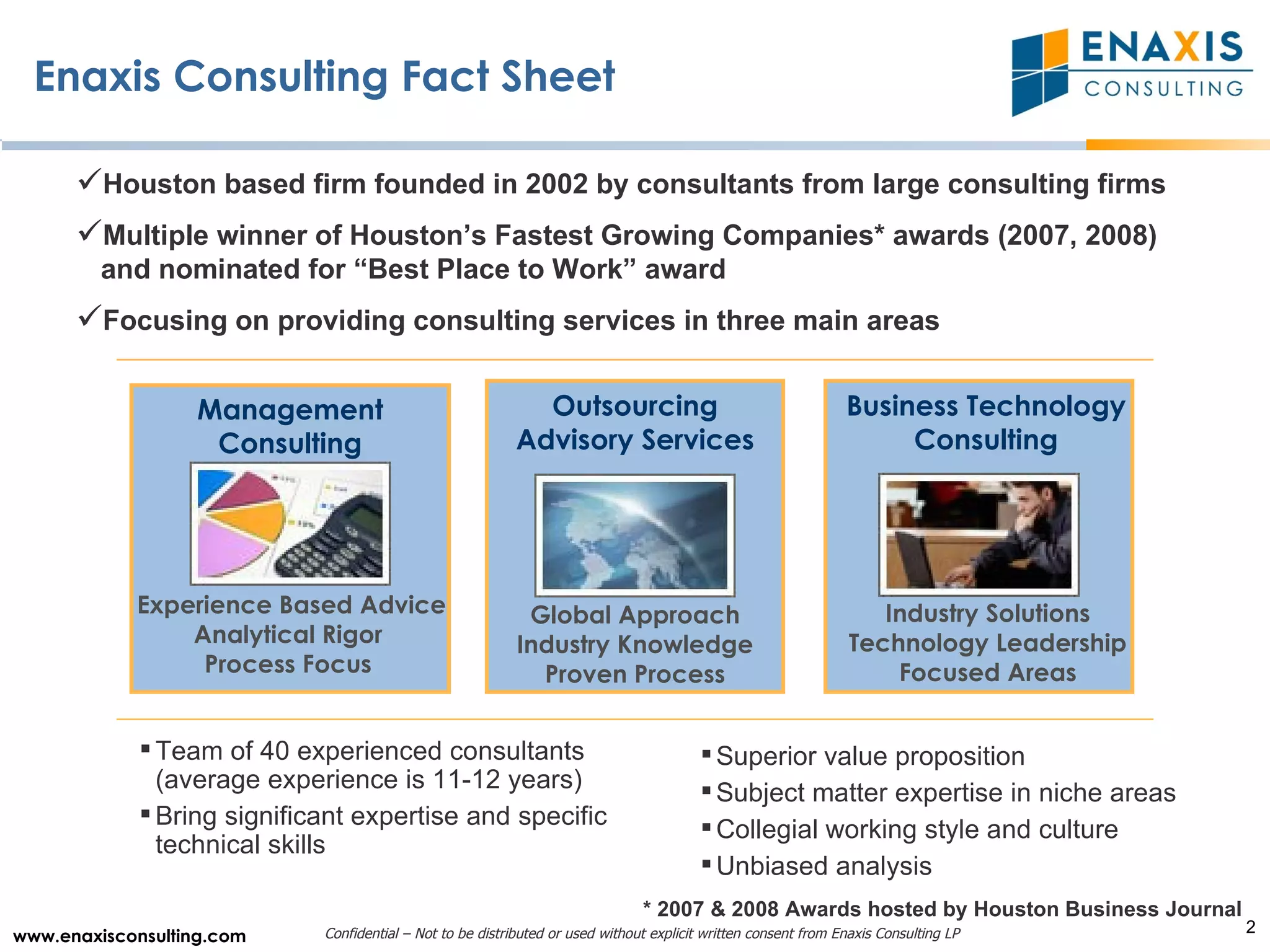 Enaxis Consulting is a Houston-based management consulting firm founded in 2002 that provides outsourcing advisory services, management consulting, and business technology consulting. They have a team of 40 experienced consultants with expertise in niche areas. Their services include vendor selection, outsourcing strategy, project management, and enabling best practices for IT service management. They help clients extract more value from investments and achieve goals for cost reduction, productivity, and globalization.