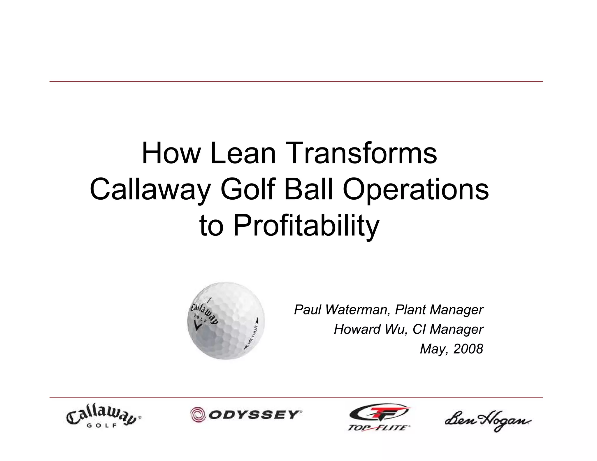 The document summarizes the transformation of Callaway Golf Ball Operations in Chicopee, MA to a lean manufacturing system. Key results of implementing lean included reducing inventory, lead times, costs, and defects while improving on-time delivery, productivity, employee engagement, and profitability. The transformation took place over several years using tools like value stream mapping, visual pull systems, standardized work, 5S, and training employees in lean concepts and problem solving.