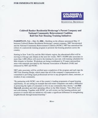 NRT Incorporated and the National Community Reinvestment Coalition are rolling out a nationwide fair housing training program for NRT's 64,000 sales associates. The training will educate associates on providing equal service to all clients regardless of background. Coldwell Banker Residential Brokerage will conduct three-hour fair housing courses for its Mid-Atlantic associates in October and November. The partnership aims to strengthen neighborhoods through fair housing practices and homeownership.