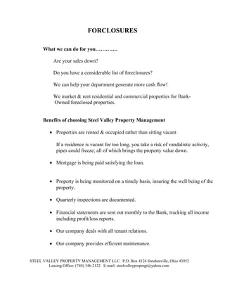 Steel Valley Property Management helps banks generate cash flow by marketing, renting, and managing foreclosed residential and commercial properties. They work to occupy properties rather than letting them sit vacant, ensuring the mortgage is paid, properties are monitored, and maintenance is provided while dealing with tenant relations. Quarterly inspections and monthly financial statements are provided to track income and the condition of bank-owned foreclosure properties.
