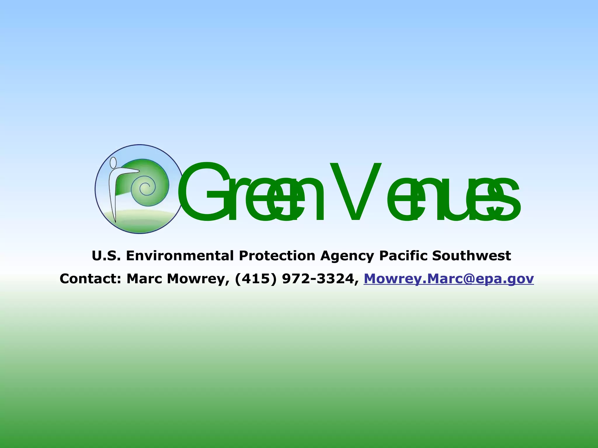 The document discusses the EPA's Green Venues program which provides criteria and partnership opportunities to help large venues like convention centers, stadiums, and arenas reduce their environmental impact and costs through various sustainability measures. It outlines the environmental impacts of large venues, success stories, criteria in areas like energy, water, waste, and food service, and EPA partnership programs that can help venues implement solutions and achieve recognition.