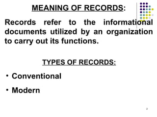 The document discusses HR records and reports. It provides details on the types of records maintained for employees, including personal information, employment history, leave records, and performance evaluations. It emphasizes the importance of records for decision making, identifying training needs, and maintaining up-to-date employee data. It also outlines principles for keeping records, such as having clear objectives, consistency, accessibility, and avoiding duplicate entries.