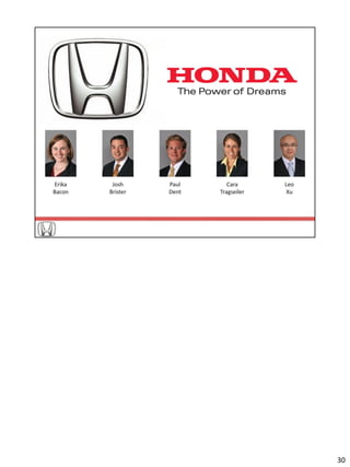 Honda has pursued environmental technologies since its establishment. In 2009, Honda GX will be the first mass produced natural gas vehicle. Honda has reached its leading position through internal development and joint ventures. It has manufacturing advantages like just-in-time parts delivery. A new plant in Indiana and others have begun operating in 2008. Business diversification into motorcycles will support Honda in difficult markets. Honda is well-positioned to benefit from future demand for efficient vehicles and growth in developing markets. Honda's competitive advantages are its engineering design, research and development capabilities, and strong brand which should remain sustainable.