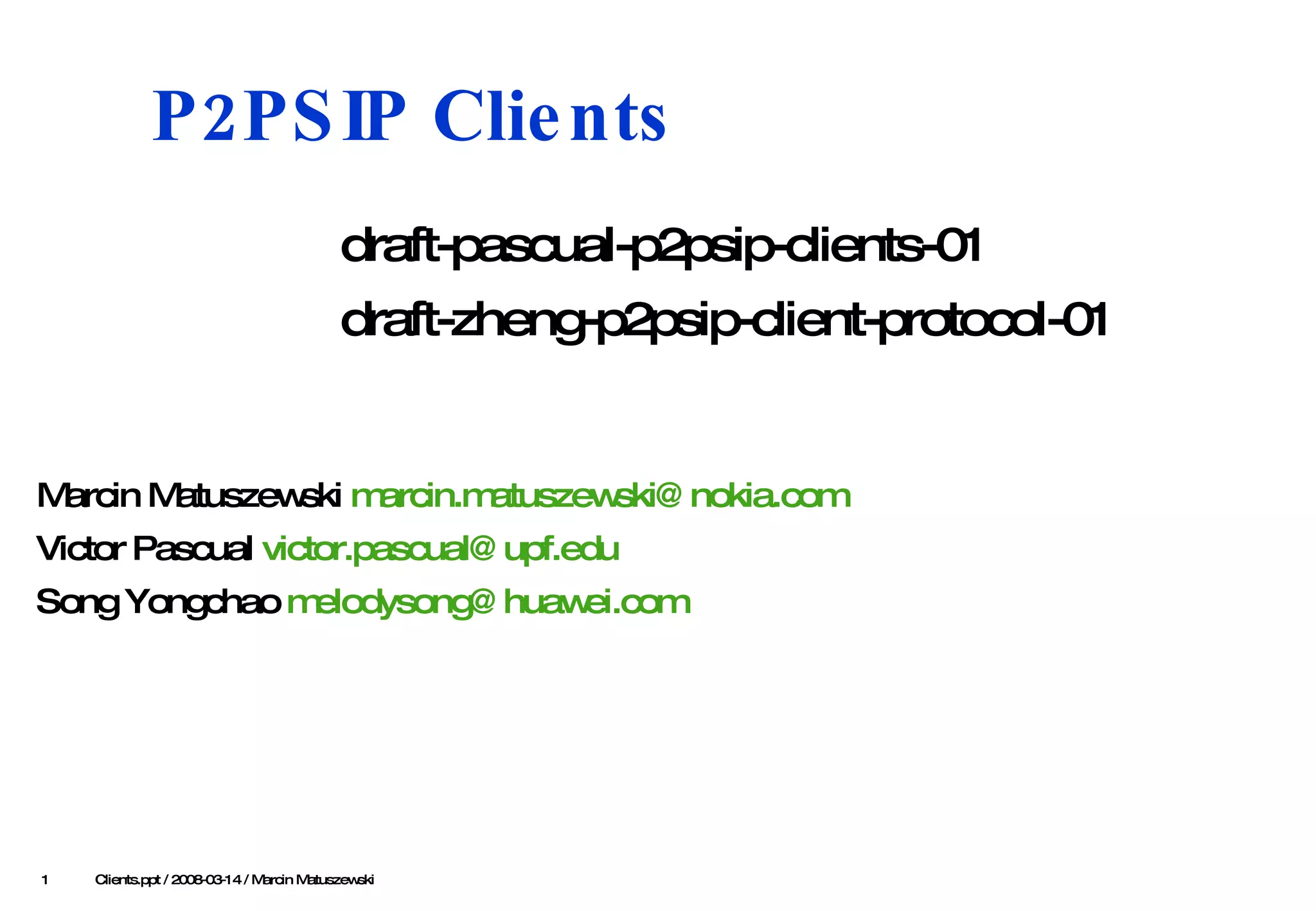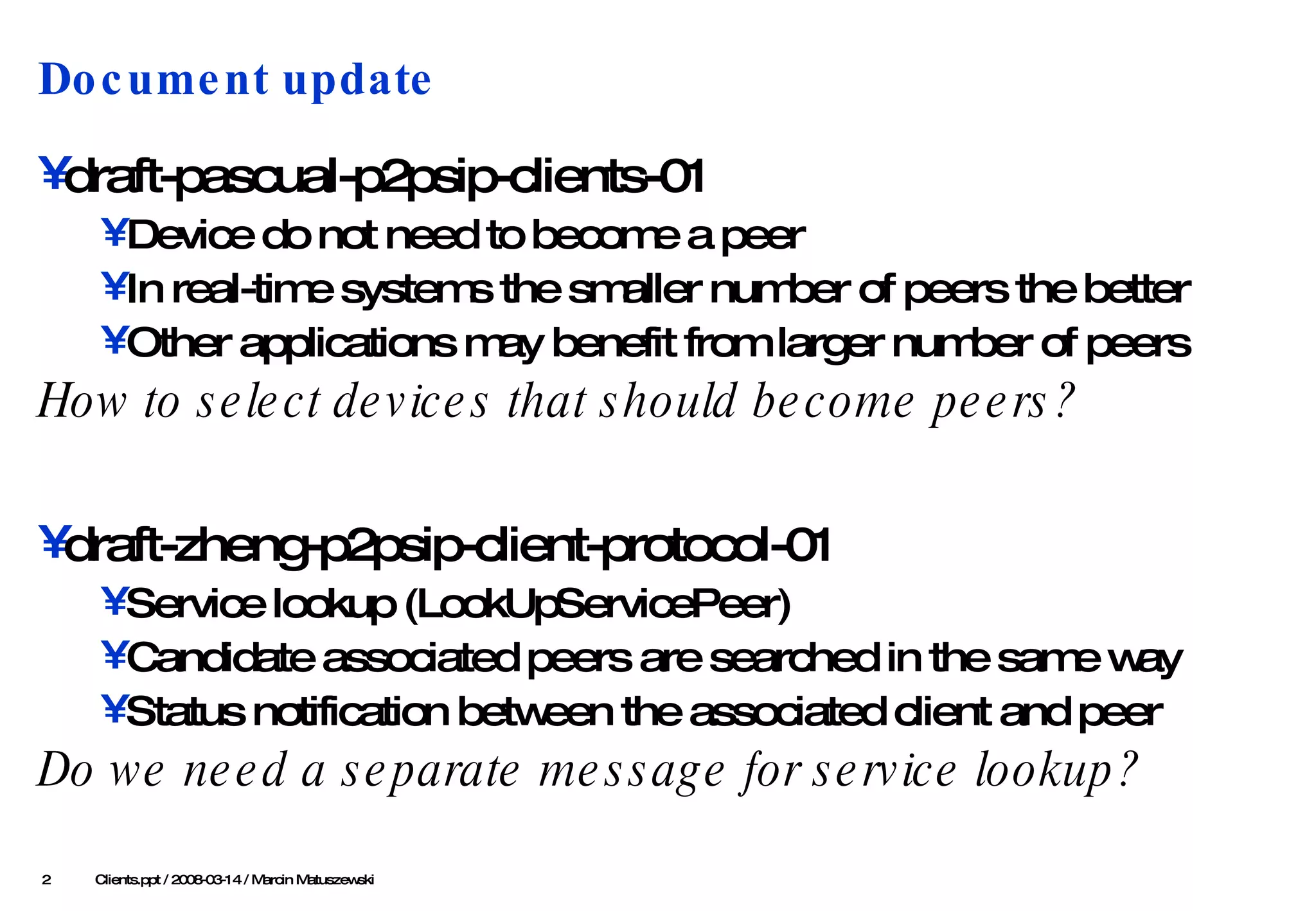 This document discusses different types of nodes in a peer-to-peer network: pure clients, pure peers, and client-peers. Pure clients only offer basic functions without implementing the distributed hash table (DHT), while pure peers implement the full DHT. Client-peers can act as either a client or peer depending on factors like battery level and network connectivity. The document also considers issues like how nodes transition between client and peer roles and how clients can look up services from multiple peers.