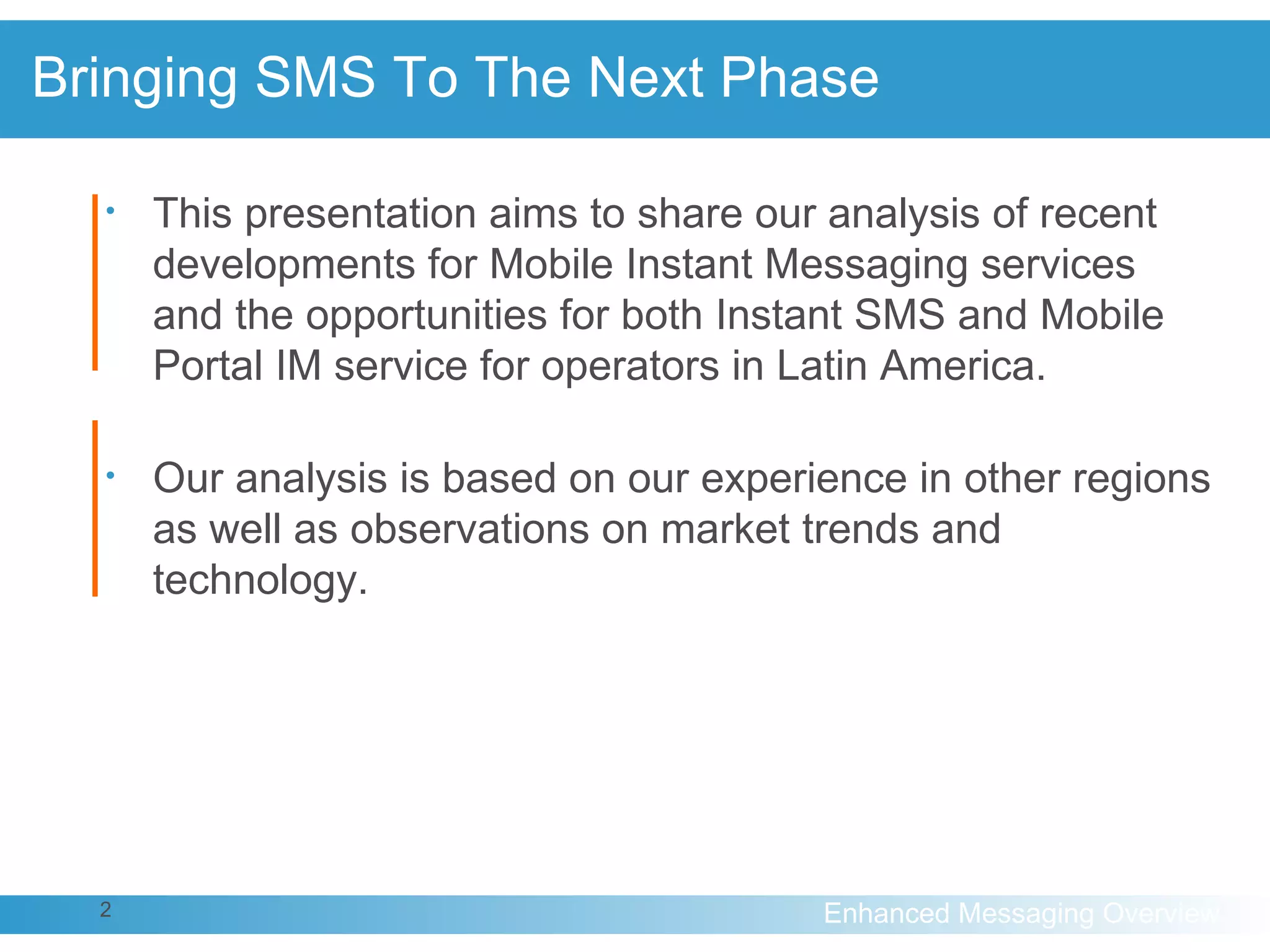 The document analyzes the evolution of messaging services, focusing on the introduction of Instant SMS as a solution to enhance user experience by combining SMS with instant messaging functionalities. It highlights market trends, the importance of addressing user demands for richer communication, and the potential benefits for operators in terms of revenue and efficiency. Instant SMS is positioned as a necessary step towards a fully converged messaging solution that meets the growing user expectations in Latin America and beyond.