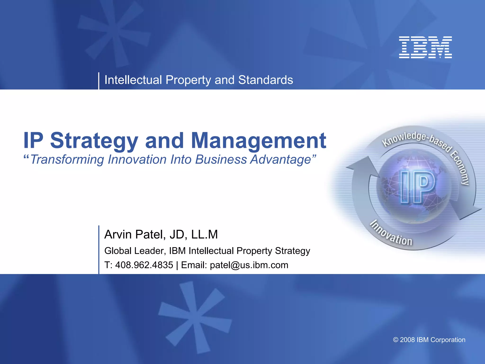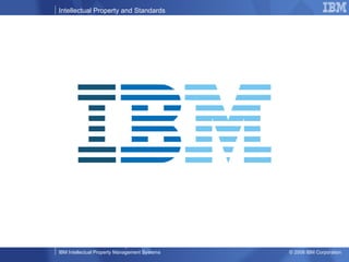 The document discusses the importance of intellectual property (IP) strategy and management for driving business advantage and innovation. It outlines how IBM uses IP to generate income, influence policies, differentiate offerings, and promote open standards. It also notes that IP will be a key geopolitical issue as the focus shifts to maximizing intellectual capital through shared ownership and collaboration.
