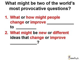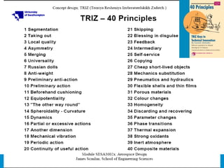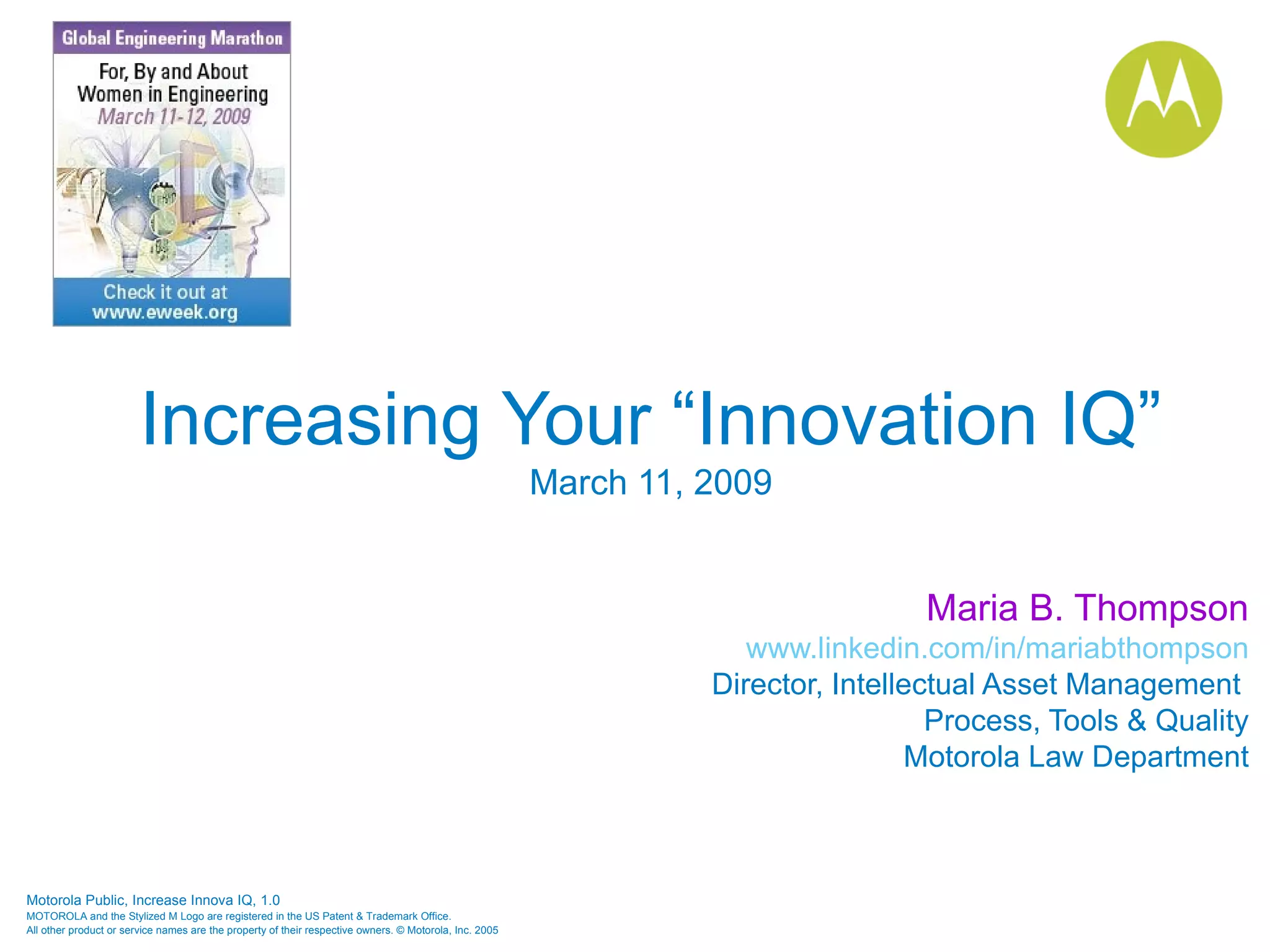 The document discusses increasing one's 'innovation IQ' through various creative problem-solving techniques and methodologies, emphasizing the importance of asking questions to enhance idea generation and implementation. It presents the TRIZ methodology for inventive problem solving, as well as guidelines for effective team ideation and managing the innovation process. Additionally, it highlights the role of patents and intellectual property as incentives for innovation and the need for proactive problem-solving skills in engineering and science.