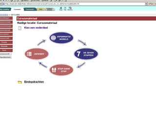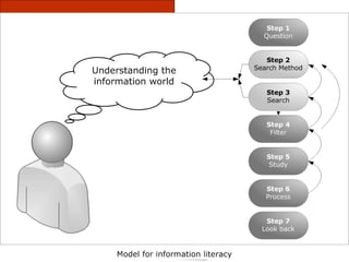 This document discusses a 7-step model for teaching information literacy skills through a blended learning course. The course introduces information literacy concepts and has students work through cases to practice the 7 steps: defining an information need, searching strategies, searching for information, selecting useful information, analyzing information, processing information, and evaluating the search process. The blended course involves both classroom meetings and an online e-learning component with interactive exercises and assignments to develop students' abilities to independently manage their learning and use information effectively.