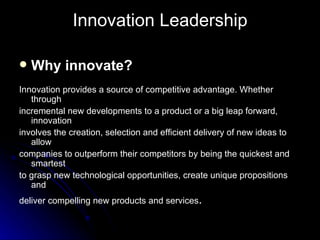 The document discusses innovation leadership and why innovation is important for competitive advantage. It states that innovation is significant both during economic growth and recession as it allows companies to stand out from competitors and drive new growth. It also positively impacts company culture and the external environment. The document then evaluates different ways to measure innovation performance, stating that the Innovation Index which accounts for patents, employees, R&D spending, and revenue is the most effective approach. Company size and geography can also influence innovation success, though do not guarantee it. Finally, it outlines three phases in the evolution of innovation capabilities over the past 20 years.