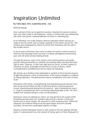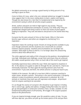 This document discusses inspiration and its importance. It states that inspiration gives individuals the will to face hurdles and stretch their limitations. It allows one to feel "high on life" and in a state of transcendence. Inspiration makes the world go round by providing streams of energy even when facing constraints. It gives life purpose and allows ideas to flow. The document argues that inspiration is the fundamental building block of humanity and what gives struggle in life purpose.