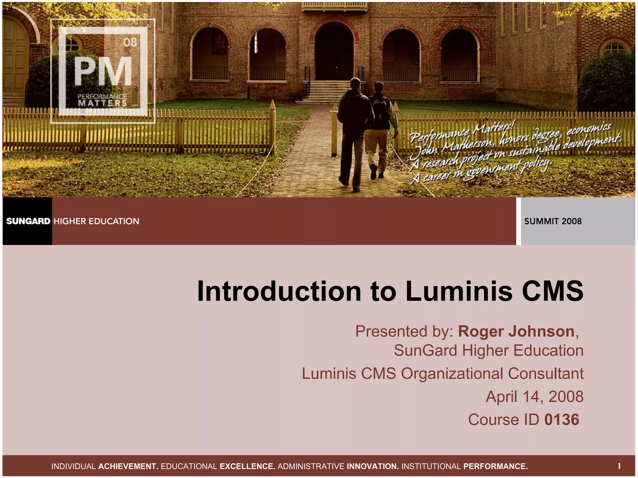 Luminis CMS allows non-technical users to easily create and manage web content while maintaining design consistency across an institution's websites. It empowers departments to independently update their pages and reduces the IT burden of web maintenance. Key benefits include distributed authorship, standardized templates and navigation, automated workflows for approvals, and the ability to balance institutional branding with individual departmental needs online.