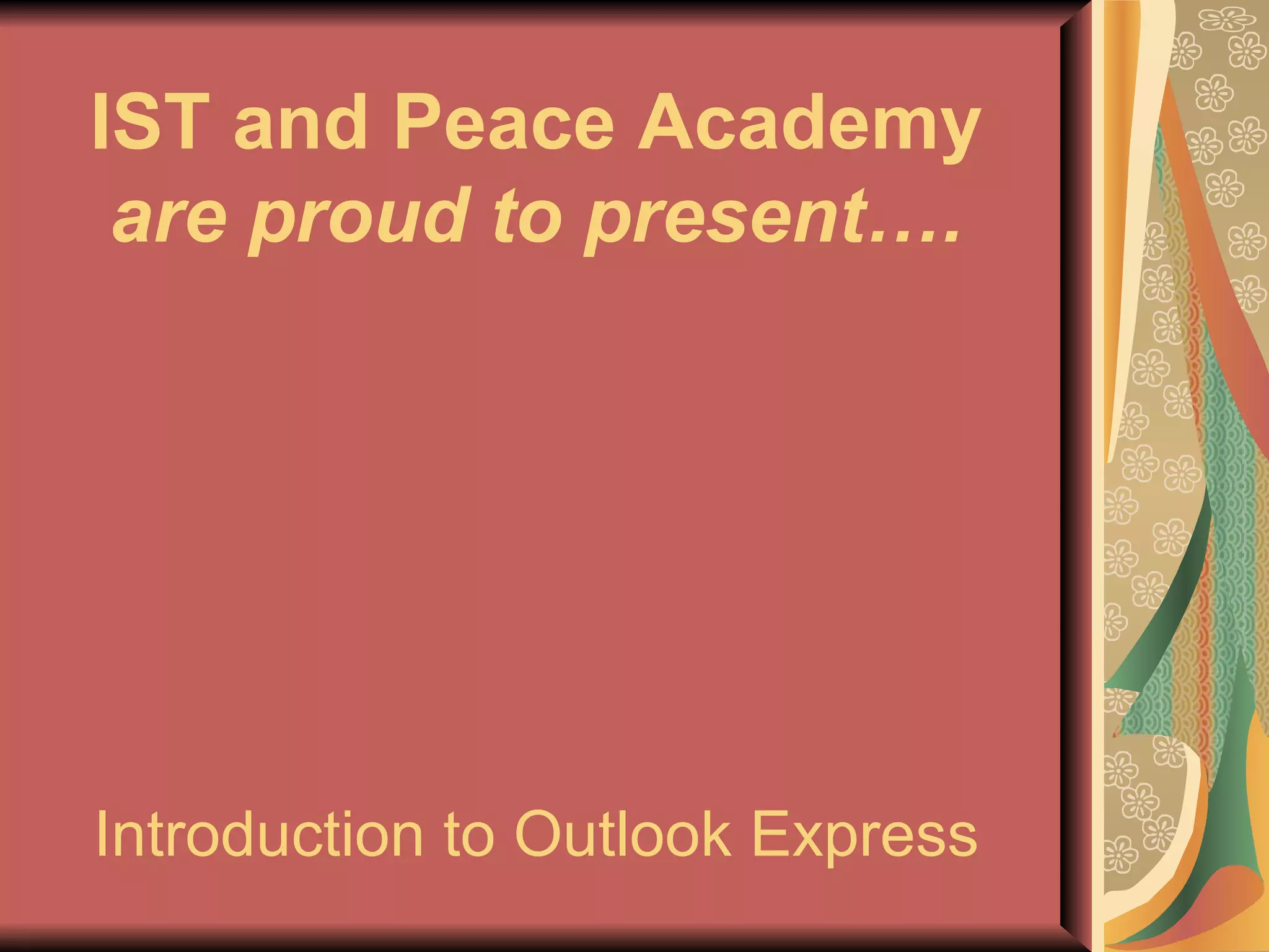 This document provides an introduction and overview for a class on setting up and using Outlook Express. The class will cover running the Outlook Express wizard to set up an email account, the basic functions of Outlook Express, and reviewing questions from students. It lists the instructor's contact information and outlines the topics to be discussed, including setting up an account using the wizard, the different types of email boxes, and starting fresh after initial setup. Students are encouraged to submit any additional questions.