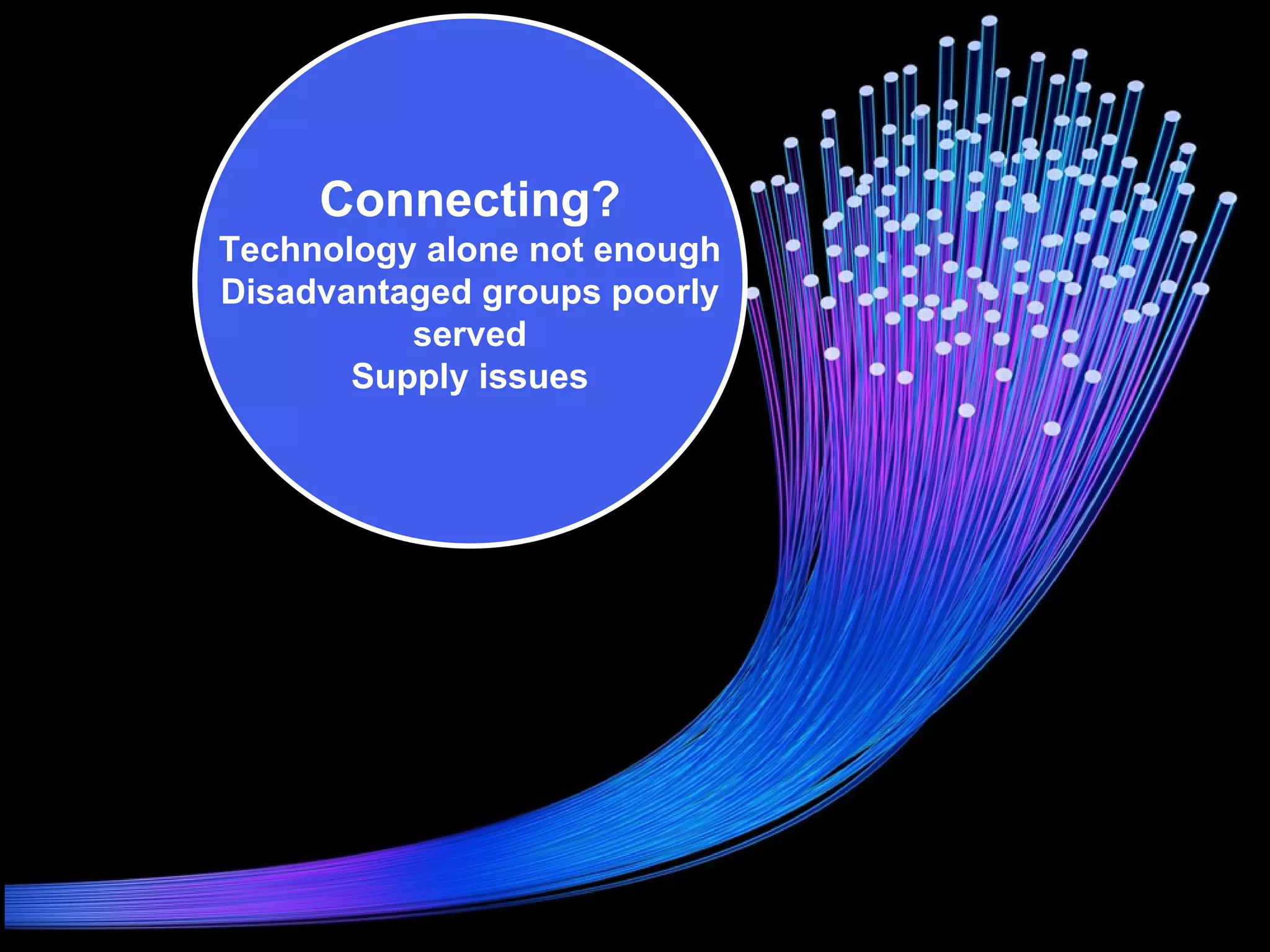 The document discusses the challenges of connectivity and technology for disadvantaged groups, highlighting issues such as poor service delivery to micro businesses and ineffective e-learning solutions. It emphasizes the importance of engaging individuals and creating supportive learner environments, as well as the need for appropriate resources and tutor skills to enhance technology use. Ultimately, it advocates for a focus on critical needs and peer support to improve learning outcomes.
