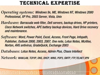 James Perrine has over 20 years of experience in technology roles. He has expertise in various operating systems, hardware, software, databases, and networks. Some of his accomplishments include designing a windows-based network for a K-8 school and procuring, installing, and managing a student information system. He has received several awards for customer satisfaction and outstanding service throughout his career.